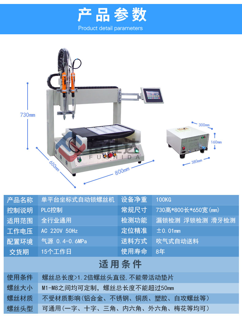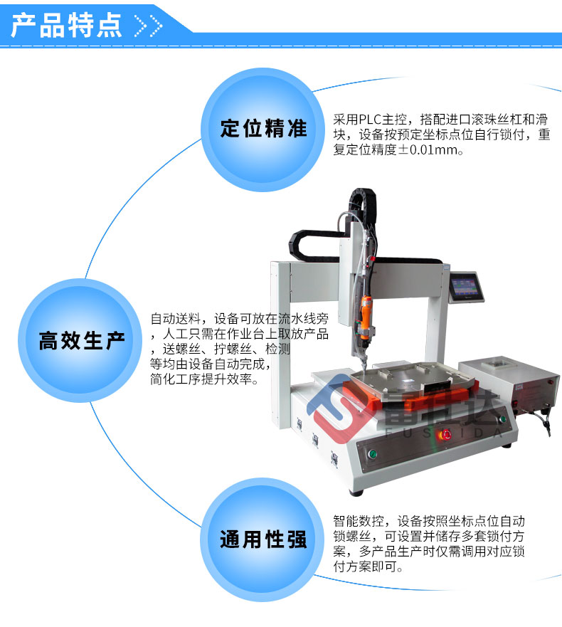 富仕達(dá)單平臺(tái)自動(dòng)鎖螺絲機(jī)是指單平臺(tái)坐標(biāo)式自動(dòng)鎖螺絲機(jī),通常用在面積較大產(chǎn)品,如:寫字板、大家電、天花吊頂、大型玩具及大型LED模組等。